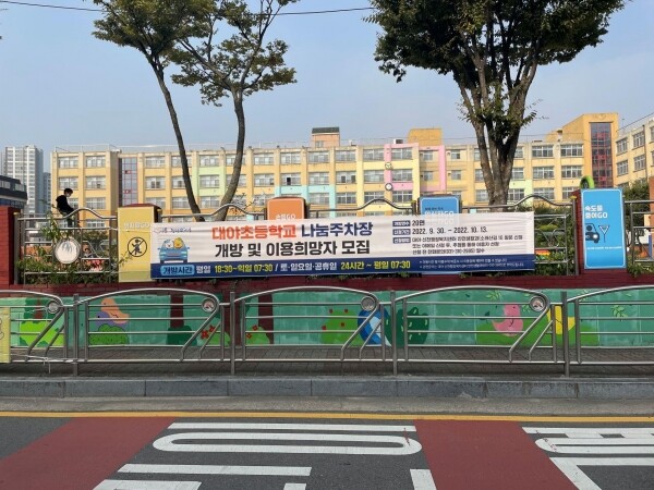 작년 8월에 협약을 체결한 대야초등학교 나눔주차장은 지난 여름방학에 조성 공사를 완료했으며 신청 기간은 10월 13일 또는 정원 초과 시까지다.