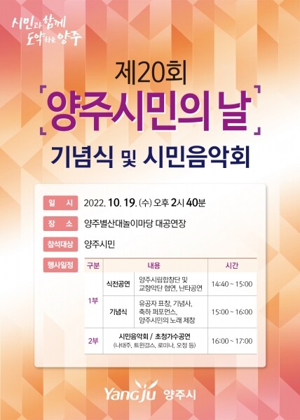 시 관계자는 “코로나19 여파로 비대면 행사로 진행돼 온 양주시민의 날 기념식을 3년 만에 시민음악회와 연계해 열게 됐다”며 “화합과 참여를 바탕으로 양주시민의 자긍심으로 높이기 위해 다채로운 문화행사를 마련한 만큼 그간 힘들었던 시민들에게 위로와 응원의 시간이 되길 바란다”고 말했다.