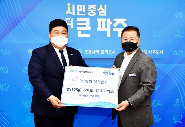 김경일 파주시장은 “파주청년회의소의 따뜻한 이웃사랑 마음이 널리 퍼져, 나눔문화가 확산되길 바란다”며 “시민을 위한 변함없는 애정과 성원을 부탁드린다“고 말했다.