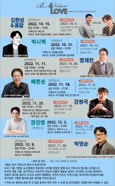 올 해 12월 9일까지, 관내 4개 도서관에서 약 10주간 진행되는 ‘북포러브’는 엄선된 작가의 강연을 즐길 수 있는 ‘북토크’와 본 행사를 알차게 즐기기 위한 ‘사전 독서모임’으로 이루어진다.