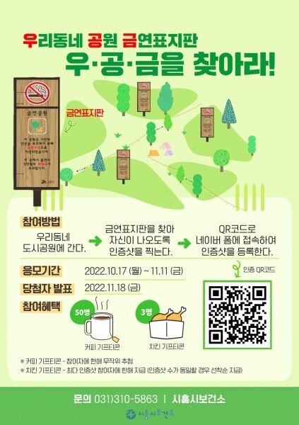 이벤트 참여방법은 우리동네 도시공원에 방문한 뒤, 금연표지판을 찾아 자신이 나오도록 인증샷을 찍어, 안내문의 QR코드를 통해 네이버 폼에 등록하면 된다.