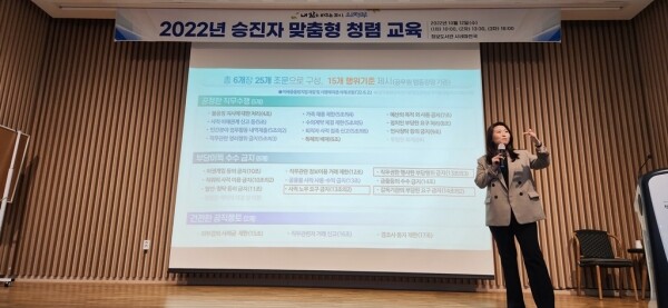 교육은 국민권익위원회 청렴연수원 배정애 청렴교육 전문강사를 초빙해 ‘청렴은 실천이다’라는 주제로 사례로 보는 공익신고와 공무원 행동강령 공직자 이해충돌방지법의 이해 공직자에게 필요한 청렴 인성과 갑질 예방에 대한 내용으로 진행됐다.