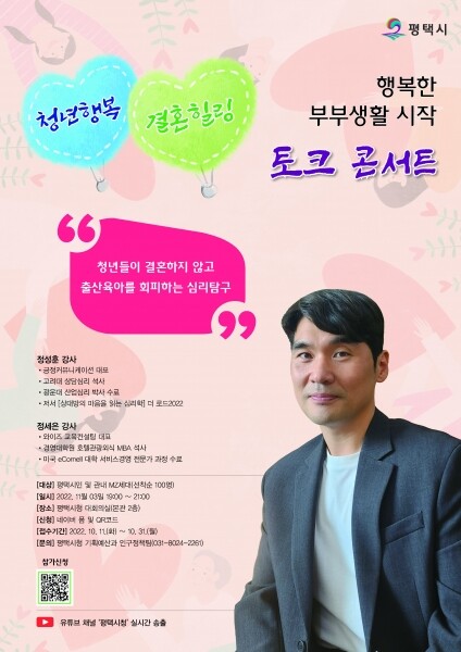 이번 콘서트는 청년세대, 부부 등을 대상으로 결혼, 출산, 육아 등 걱정거리에 대해 함께 고민하고 해결방안에 대해 생각해보기 위해 기획됐으며 ‘청년들이 결혼하지 않고 출산 육아를 회피하는 심리탐구 및 행복한 부부생활 시작’이라는 주제로 상담심리 전문가 정성훈 강사의 강연과 토크쇼가 진행된다.