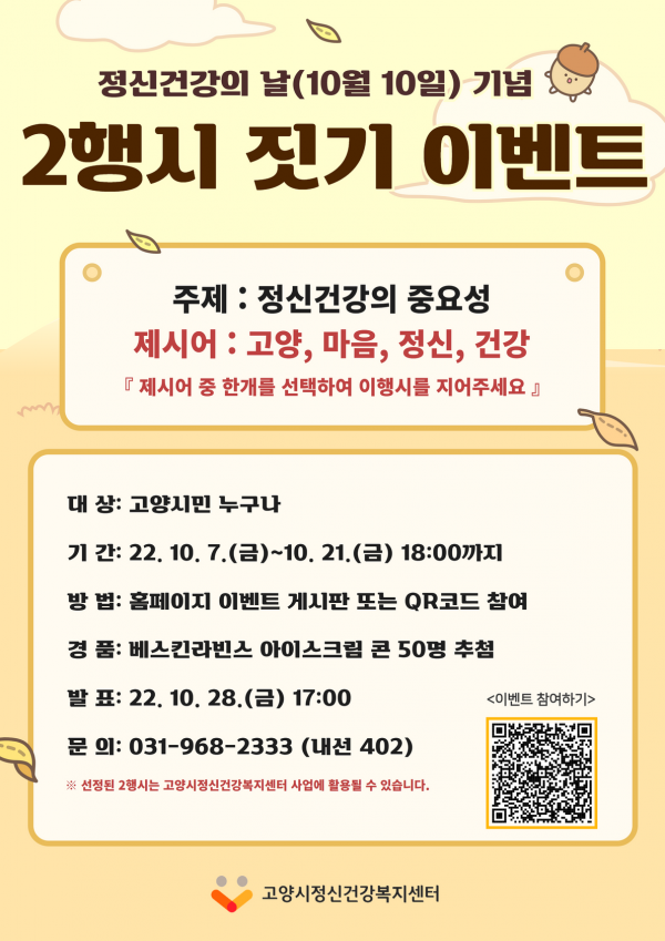 이번 이벤트는 정신건강의 날을 맞이해 정신건강 관련 제시어 ‘고양, 마음, 정신, 건강’ 중에 하나를 선택해 2행시를 지어 참여하면 된다.