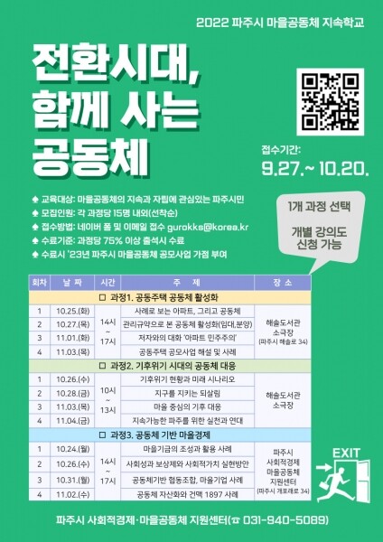 파주시 사회적경제·마을공동체 지원센터는 이번 프로그램의 후속 과정으로 파주시 마을공동체 지속학교를 10월 24일부터 11월 4일까지 운영할 계획이라고 전했다.
