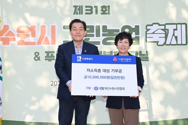 오서영 생활개선수원시연합회장은 15일 ‘2022 수원시 그린농업축제’가 열린 탑동시민농장에서 이재준 수원특례시장에게 성금을 전달했다.
