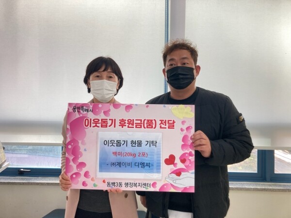[뉴스서울] 용인특례시 기흥구 동백3동은 ㈜제이비 디엠씨에서 어려운 이웃을 위해 써달라며 20㎏짜리 백미 2포를 기탁했다고 17일 밝혔다.