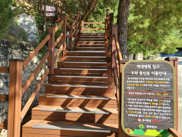 시에 따르면 제생병원 입구 쪽에서 임야로 넘어가는 구간을 목재데크 계단, 유도 및 경계용 난간, 목교 및 침목계단, 흙길노면 다지기 등 각종 시설물 설치 및 등산로 정비를 통해 안전을 확보하고 자연스럽게 연결해 등산객의 편의를 도모했다.