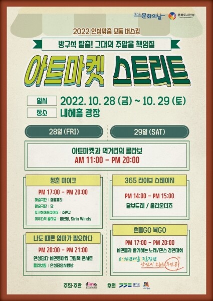 2022 아트마켓 스트리트는 안성시와 동아방송예술대학교가 상생협약을 체결하고 추진하는 사업으로 예술인에게는 활동 무대와 성장 기회를 제공하고 시민에게는 문화 향유 기회와 일상의 활력을 제공하고자 마련됐다.