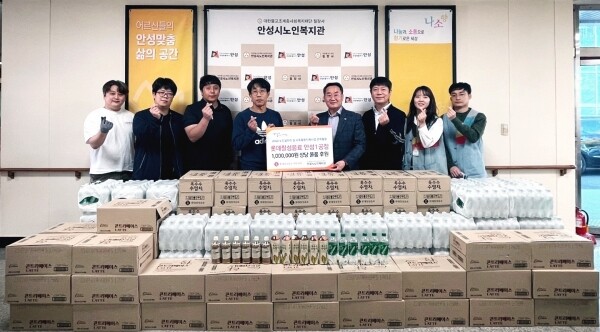 후원물품 전달식에는 안성시노인복지관 김동선 관장 및 직원들과 롯데칠성음료 안성1공장 관계자들이 참석했다.