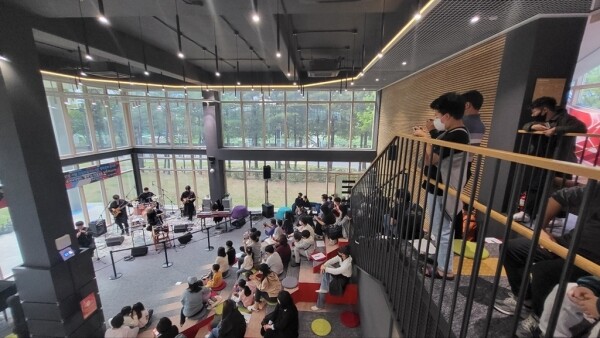 이날 1층 오픈스테이지에서 열린 콘서트에는 도서관을 이용하는 시민과 어린이를 동반한 가족 100여명이 자유롭고 편안하게 퓨전국악밴드 ‘경지’의 공연을 관람했다.