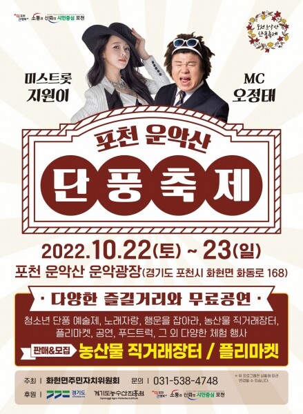 축제는 화현면주민자치위원회의 주관으로 진행되며 일상에 지친 시민과 방문객들이 단풍을 보며 남녀노소 모두가 즐길 수 있는 프로그램으로 구성했다.
