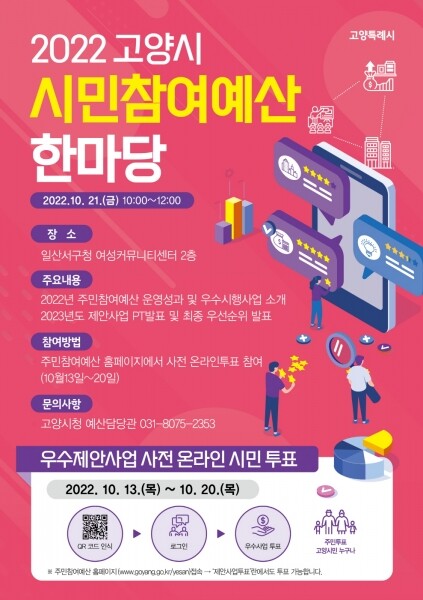 고양시는 이날 행사를 통해 2023년도 주민참여예산 우수 제안사업과 2022년도에 실행된 주민참여예산 우수 실행사업을 소개하고 사전 온라인 시민투표 결과를 발표할 예정이다.