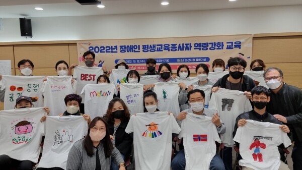 이번 교육은 오산성인씨앗 야간학교, 장애인부모연대 오산지부 등 10개 단체 종사자 20여명과 장애인 평생교육 양성과정 수료자 15여명이 참여한 가운데 공정과 평등에 대한 평생학습 감수성 키우기, 오산시 평생학습에 대한 생각을 티셔츠로 표현하기, 소통과 협력의 필요성, 장애인 평생교육 담당자의 역할 바로 알기 등의 내용으로 진행했다.