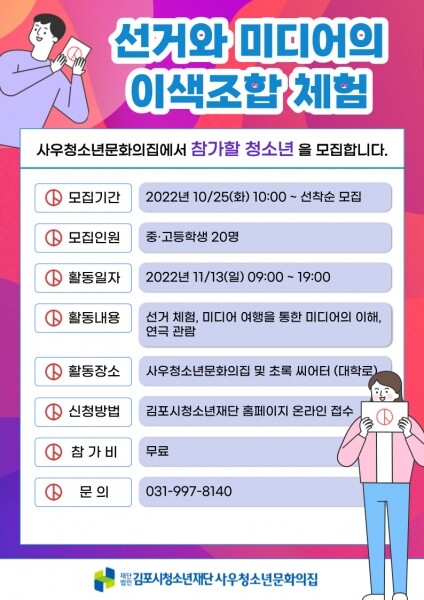 김포시청소년재단 조성훈 수련관장은 “선거와 미디어의 이색조합을 통해 선거의 의미와 디지털 시대의 변화되는 선거의 모습을 이해할 수 있도록 적극 지원 하겠다”고 말했다.