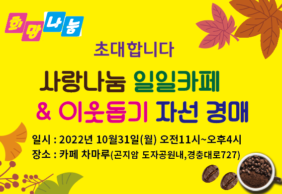 특히 이번 일일 카페에는 나눔 바자회와 자선 경매장도 동시에 운영할 예정이며 주민자치센터의 댄스 공연과 섹소폰 연주 등 재능기부 공연도 함께 준비돼 있어 볼거리 풍성한 즐거움을 선사할 계획이라고 전했다.