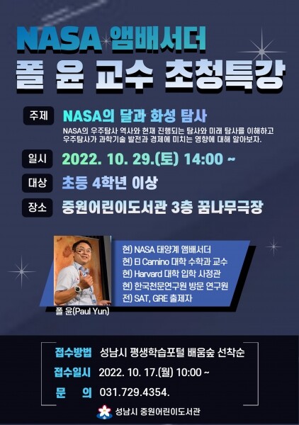 미국 항공우주국의 태양계 시스템 홍보대사인 폴 윤 미국 엘카미노 칼리지 수학과 교수가 ‘NASA의 달과 화성 탐사’를 주제로 강의 진행한다.