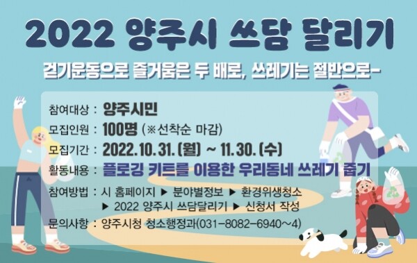 모집인원은 총 100명이며 참여를 희망하는 시민은 양주시 홈페이지 내 ‘2022 양주시 쓰담 챌린지’에서 선착순으로 온라인 접수하면 된다.