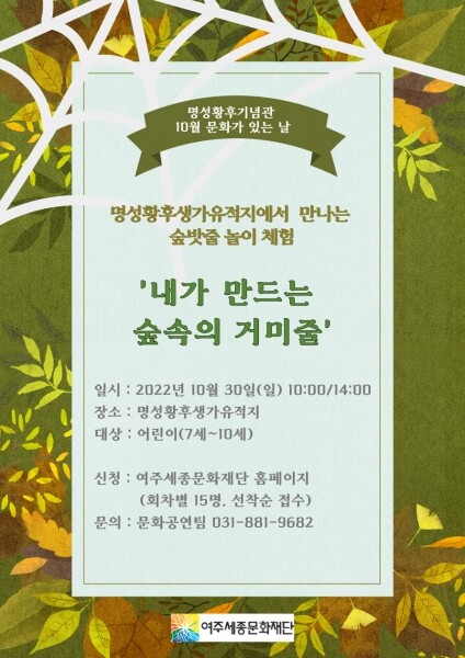 매달 다양한 프로그램을 선보이는 명성황후기념관 문화가 있는 날의 10월은 가을을 맞아 어린이들이 야외에서 밧줄로 대형 거미줄을 만들고 이를 활용해 다양한 신체 놀이를 경험할 수 있는 숲밧줄 놀이다.