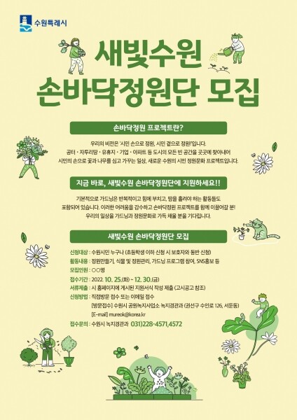 수원시 관계자는 “시민과 기업, 공공기관 등이 커뮤니티를 구성해 도시 구석구석에 아름다운 손바닥정원을 조성할 것”이라며 “많은 시민이 손바닥정원단에 지원해주시길 바란다”고 말했다.