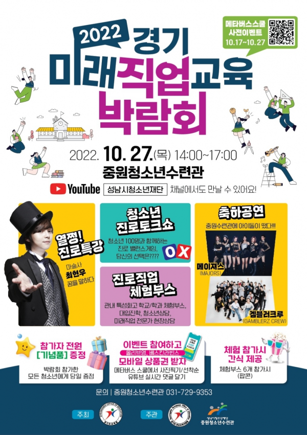 이 행사는 경기도교육청 주최, 성남교육지원청과 성남시 청소년재단 중원청소년수련관 주관으로 개최하는 진로박람회로 성남 관내 6개 특성화고등학교와 한국폴리텍대학 등 유관 기관과 성남시진로멘토단, 중원심리지원단, 청년창업단체 우드림, 그린유니버스 등 단체에서 함께 참여하며 관내 진로진학리더교사들과 다양한 미래직업 전문가들이 함께해 청소년 진로 진학 상담과 미래직업에 대해 탐색과 체험의 기회를 제공했다.