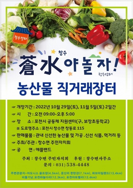 행사는 창수면 주민자치회와 창수면 농산물 생산농가가 함께 장터를 개장한다.