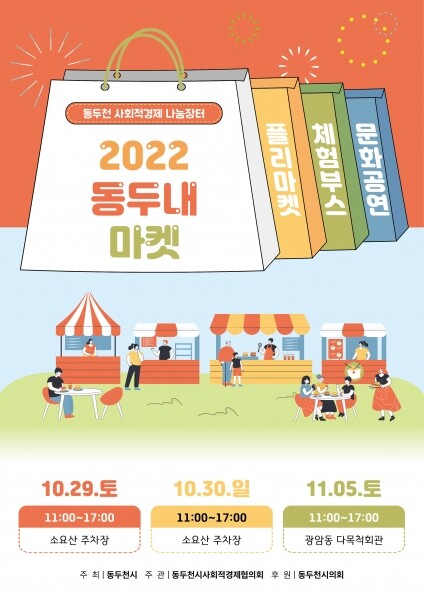 나눔장터는 오전 11시부터 오후 5시까지 개최되며 동두천시 사회적기업, 마을기업, 협동조합, 공동체, 보산동공방 등 14개 판매·홍보부스를 설치해 생산제품 판매, 홍보, 체험을 진행한다.