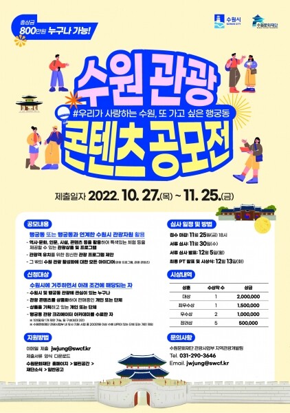 이 공모전은 기추진 중인 ‘행궁동 관광 크리에이터 아카데미’와 연계된 사업으로 아카데미 교육생과 더불어 수원시민 모두를 대상으로 참신한 아이디어를 공모한다.