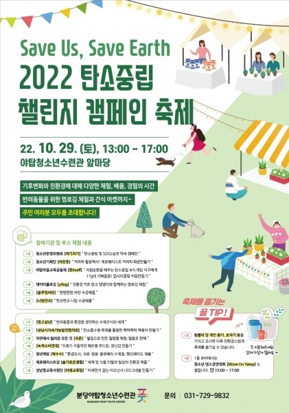 29일 오후 1시부터 5시까지 분당야탑청소년수련관 앞마당에서 진행되는 이번 축제는 청소년, 환경활동가, 예술가, 주민들이‘기후 위기’를 인식하고‘탄소중립’의 가치와 필요성을 공유하고 소통함으로써 더 나은 미래를 위한 기후 행동에 동참해나갈 수 있도록 다양한 교육 체험 부스, 가치소비 마켓을 운영할 계획이라고 전했다.