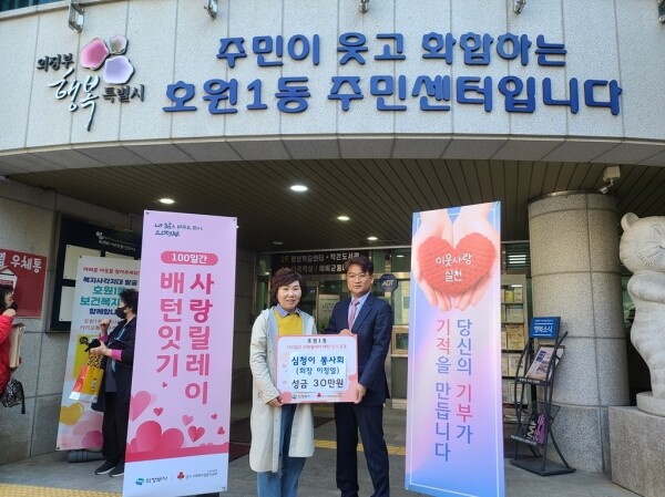 조복현 호원1동장은 “평소 이웃사랑을 실천하고 특히 100일 사랑릴레이 배턴 잇기 운동에 매년 참여해 주신 심청이 주간보호센터 대표님을 비롯한 회원들에게 깊이 감사드린다 전달해주신 성금은 우리 주변 어려운 이웃들에게 따뜻한 겨울 선물이 될 것이며 호원1동에서도 취약계층 지원에 최선을 다하겠다”고 밝혔다.