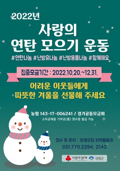 또한, 모금된 성금과 물품은 경기사회복지공동모금회를 통해 양평군으로 배분되며 기부금액에 대해서는 연말정산 시 소득공제 혜택을 받을 수 있다.