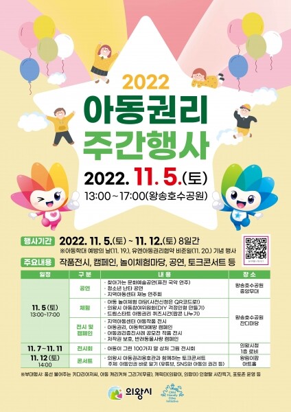 그 개막을 알리는 아동권리축제는 11월 5일 오후 1시 왕송호수공원 중앙무대 및 잔디마당에서 의왕시 대표 아동참여기구인 아동참여위원회의 행사기획과 다양한 유관기관의 협력으로 만 18세 미만 모든 아동이 즐길 수 있는 축제의 장으로 마련된다.