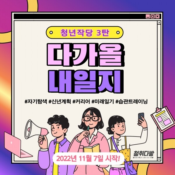 청년작당 프로젝트는 ‘청취다방 2022년 작심삼일은 없당’의 줄임말로 혼자서는 만들기 어려운 습관을 21일간 함께하는 챌린지로 타파해보자는 취지로 기획됐다.