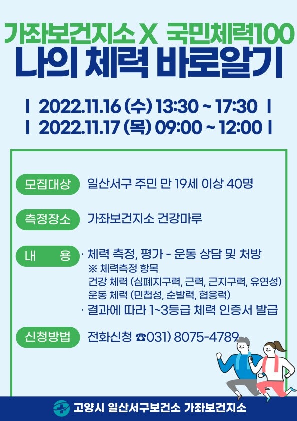 일산서구보건소 가좌보건지소 관계자는“이번 기회를 통해 자신의 체력상태를 파악하고 자신에게 맞는 운동처방을 받아 주민들이 효율적이고 효과적인 운동을 해나가기 바란다”고 말했다.
