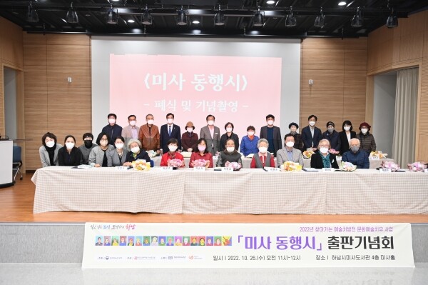 28일 하남시에 따르면 하남시립도서관은 지난 26일 하남시미사도서관 4층 미사홀에서 이현재 하남시장, 강성삼 하남시의회 의장을 비롯해 정병용 하남시의회 자치·행정위원회 위원장, 오승철 하남시의원 등 관계자 70여명이 참석한 가운데 ‘2022 찾아가는 예술처방전 사업-미사 동행시’ 출판기념회를 개최했다.