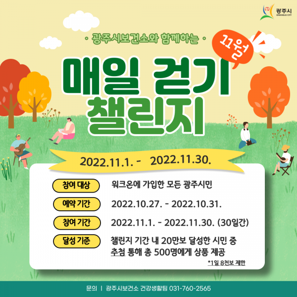 참여를 원하는 시민은 스마트폰에 모바일 걷기 앱 ‘워크온’을 설치한 후 광주시 공식 커뮤니티인 ‘광주시 워킹투게더’에 가입하고 11월 챌린지 ‘예약하기’ 또는 ‘참여하기’를 누르시면 누구나 손쉽게 참여할 수 있다.