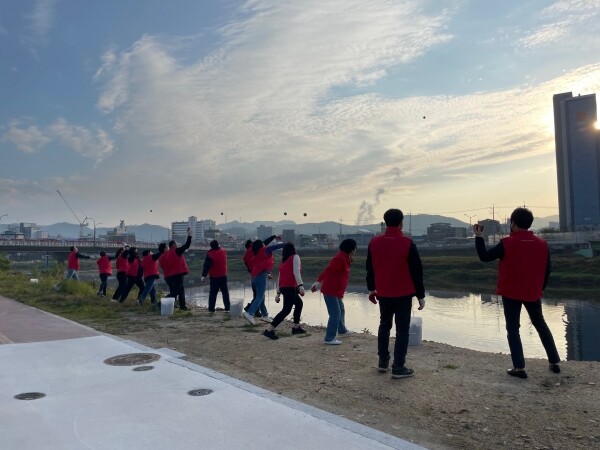20여명의 위원들은 신천의 수질 개선을 위해 신천교에서 500여개의 EM흙공을 투척했다.