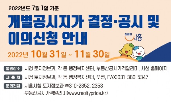 이번에 결정·공시되는 개별공시지가 대상 토지는 2022년 1월 1일부터 6월 30일까지의 분할, 합병, 지목변경 등 토지이동이 발생된 992필지로 감정평가사의 검증과 토지소유자의 열람 및 의견을 청취한 후 시흥시 부동산가격공시위원회 심의를 거쳐 확정됐다.