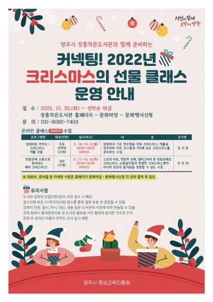 시 도서관 관계자는 “이번 프로그램을 통해 지역주민들이 가족, 친구, 이웃과 함께 크리스마스의 설렘, 즐거움 등의 감성을 나누며 친밀한 관계를 형성하고 더 나아가 연말 주위 사람들을 돌볼 수 있는 의미있고 뜻깊은 시간이 되길 바란다”며 “앞으로도 도서관이 지역주민과 일상을 공유해 지역사회에서 자연스러운 연결을 통해 강화된 지역 커뮤니티의 거점 역할에 최선을 다하겠다”고 말했다.