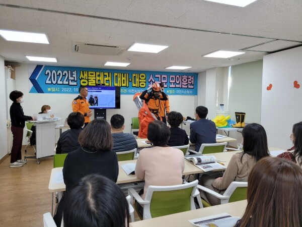 훈련내용으로는 질병관리청에서 배포한 동영상 이론 강의를 익히고 상황 발생 시 투입요원의 안전을 위해 반드시 착용하게 되는 개인보호복의 착·탈의 실습과 탄저균등 9종의 다중탐지키트검사 및 환경 검체 채취방법을 습득하고 검체를 안전하게 삼중으로 포장해 검사기관에 이송하는 방법과 노출자에 대한 관리 및 역학조사과정에 대한 교육이 진행됐다.