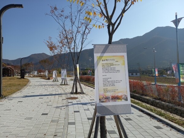 가평군문인협회에서 10월 27일부터 회원 20명이 참여해 27점의 시화족자 작품을 공원에 전시해 붉게 물들어가는 단풍나무와 자연과 문학이 오묘하게 어우러져 장관을 이루고 있기 때문이다.