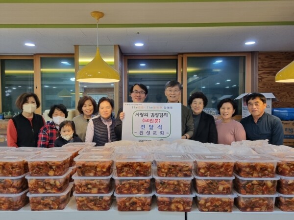 천성교회 성도 30여명과 갈매동 새마을부녀회 회원들이 모여 사랑의 마음을 담아 정성껏 김치를 버무렸으며 추운 겨울을 혼자 지내야 하는 독거 어르신 50가정에 전달했다.