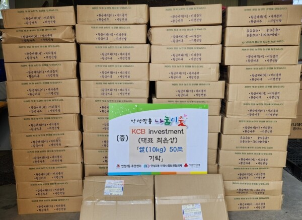 KCB investment는 새로운 가치를 창출해 투자자와 고객의 이익을 극대화하는 것을 목표로 다양한 플랫폼을 통해 안정적이고 현실적인 펀드 운용과 고객의 다양한 욕구에 부합하는 금융상품 개발 등을 하는 대체투자 전문 종합투자회사로 최윤상 대표는 “안성시 석정동이 고향이라 기부를 결정하게 됐다. 정말 어려운 이웃에게 잘 전달되길 바란다”고 전했다.