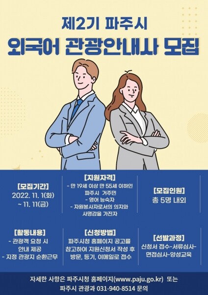 이명희 관광과장은 “파주시 외국어 관광안내사는 관광객과 직접 대면해 전문적인 해설 서비스를 제공하고 편의를 제공해 파주시 관광지 서비스의 발전에 이바지할 것으로 기대된다”며 “관광자원에 관심 있는 시민들의 많은 참여를 바란다”고 말했다.