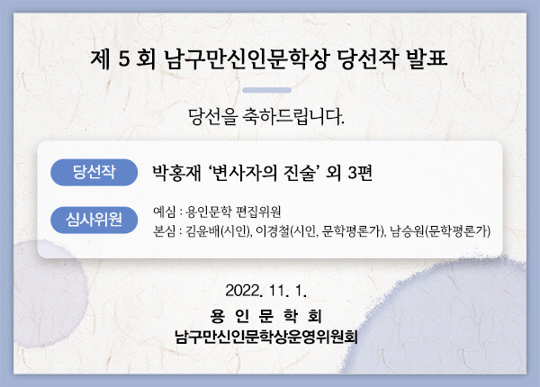 당선자에게는 상금 500만원이 수여되며 시상식은 오는 19일 용인문화예술원 마루홀에서 열리는 ‘2022 남구만문학제’에서 진행된다.
