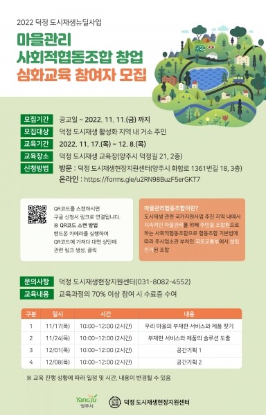 이번 교육은 오는 17일부터 12월 8일까지 매주 목요일 덕정 도시재생 교육장에서 총 4회차 대면 강의로 진행된다.