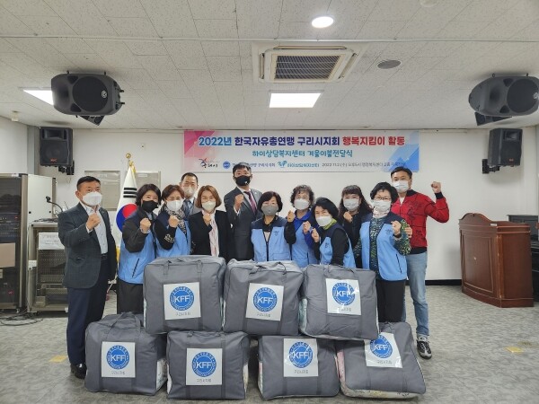 이날 전달식에는 이불 10채를 후원한 구리시 한국자유총연맹 김석진 회장과 회원들, 취약계층에 이불을 나눠주는 하이상담복지센터 민은희 센터장이 참석했다.