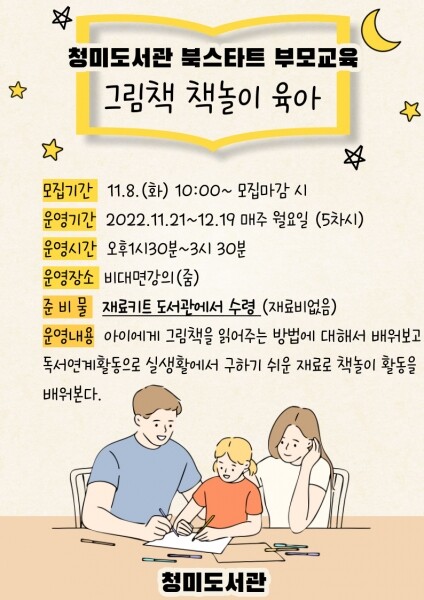 그림책 책놀이 육아 프로그램 수강생 모집은 11월 8일 오전 10시부터 이천시통합도서관홈페에서 신청 가능하며 자세한 프로그램 내용 및 일정 또한 이천시 통합도서관 홈페이지에서 확인할 수 있다.