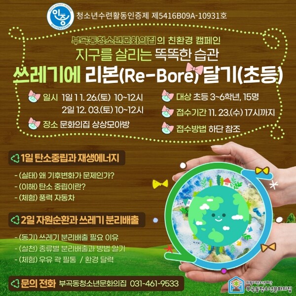 ‘쓰레기에 리본달기’는 청소년들이 생활 속에서 친환경 습관을 실천할 수 있도록 지구건강 알기 자원순환 지구사랑실천 프로그램을 운영하며 11월 26일과 12월 3일 2회기에 걸쳐 진행된다.