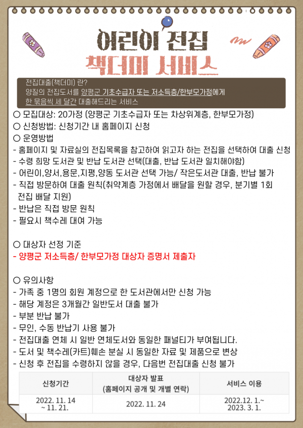 군 도서관에서 올해 처음으로 진행되는 전집 대출 서비스는 코로나19와 경제난 속 복지 사각지대에 놓인 취약계층이 보다 건강하고 나은 삶을 누릴 수 있도록 저소득 지원대책으로 기획됐으며 관내 5개 도서관 어디에서든지 대출과 반납이 가능하다.